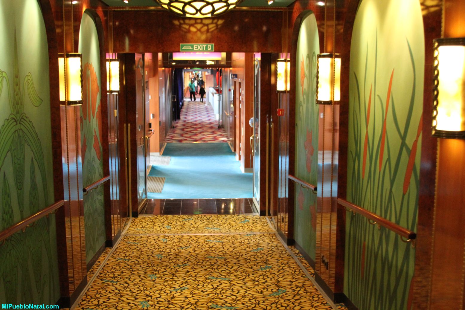 Cuando uno camina por estos pasillos, no se sabe para qué rumbo va. Una manera de darse cuenta si vas para enfrente o para la parte de atrás de la nave es siguiendo los pescaditos en la alfombra. Si vas contra ellos esto quiere decir que vas para la parte de atrás.